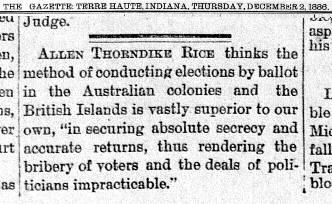 A major argument in favor of introducing the secret ballot (in the Gilded Age) was the expectation that it would reduce vote buying, which was relatively common with open voting (cf Orr; Lehoucq). For example a US newspaper in 1888 commented that “if the act of voting were performed in secret, no bribed voter could or would be trusted to carry out his bargain when left to himself” (cf Campbell 2005, 97)Susan Stokes & Thad Dunning 2010